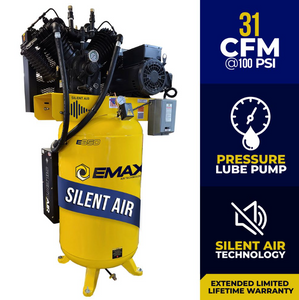 EMAX Industrial Plus Silent Air System 7.5HP 80 gal. 208-230V 1-Phase 2 Stage Vertical Stationary Electric Air Compressor w/ Pressure Lube Pump