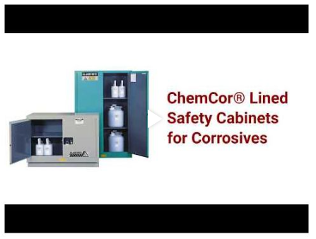 ChemCor® Lined Undercounter Hazardous Material Safety Cabinets have the same quality features found in Justrite's flammable cabinets — including double-wall, 18-gauge (1mm) welded steel construction, 2" (51mm) liquid-tight containment sump, dual vents, adjustable shelves, three-point stainless steel bullet self-latching doors with U•Loc™ padlockable handle and Haz-Alert™ reflective warning labels. An all epoxy baked-on powder-coat finish, inside and out, provides increased chemical resistance. Interior ChemCor® liner ensures complete corrosion resistance and protection. Self-close door(s) shuts and latches automatically when a fusible link melts at 165°F (74ºC) under fire conditions. Unique, concealed self-closing mechanism offers obstruction-free access to contents.