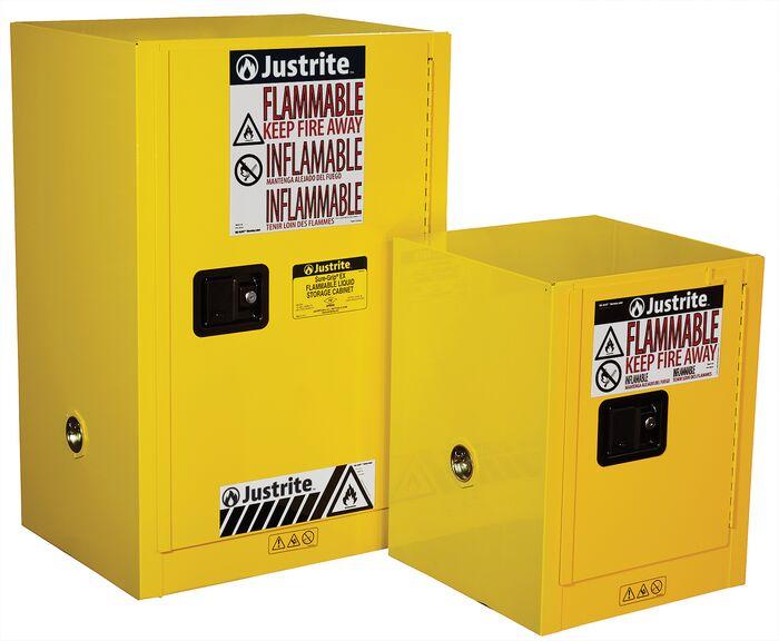 Allow increased access to often-used flammable liquids without compromising safety. Portable size keeps work areas flexible. Fit almost anywhere and provide protection when space is at a premium. Includes (1) adjustable shelf. Yellow. Complies with OSHA and NFPA regulations. 12-Gal. cabinets are FM approved.