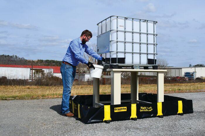 Safe, drive-in spill containment for drums, IBC totes, and tanks