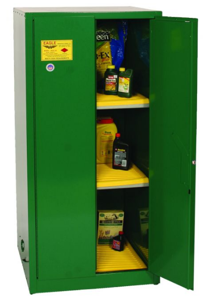 Eagle 96 Gallon, manual close, Paint and Ink Safety Cabinet is constructed of 18-gauge (1 mm) steel. The sides, top, bottom, and doors are double-walled with a 1-1/2 in (3.8 cm) air space between walls. Includes two vents, each have 2 in (5.1 cm) threaded fittings and a fire baffle and cap. Cabinets have a high gloss powder coat finish with red trilingual warning, plus grounding attachment, 3-point latch system, and 2-in (5.1 cm) raised, leakproof door sill. Each shelf is adjustable on 3 in (7.6 cm) centers, supported by 4 brackets, with a 350 lbs (159 kg) safe allowable load. Cabinets are FM-Approved and meet NFPA Code 30 and OSHA required.