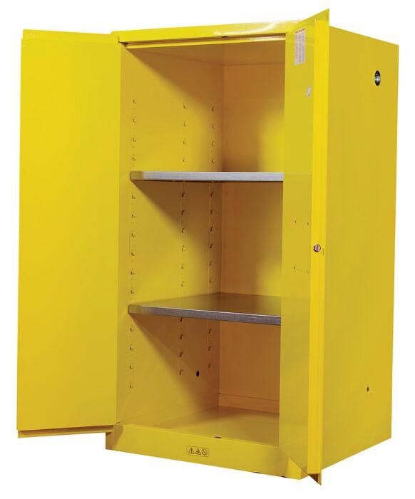 For flammable liquid storage. Shelves are adjustable. Has 2 manual-close doors.