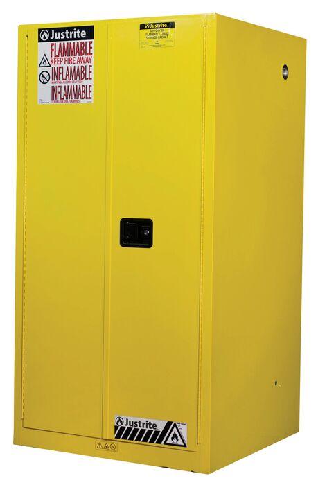 Double-wall, 18-gauge steel construction has (2) vents with flame arresters that allow hazardous vapors to be piped away if required. Integral leak-proof well contains accidental spills. Features self-latching doors with 3-point stainless steel bullet latches to help reduce fire risks. Includes U•Loc™ padlockable handle, reflective Haz-Alert™ warning labels for visibility in the dark and SpillSlope® safety shelves that direct incidental spills to the back and bottom of a leaktight 2" sump. Ten-year warranty. Yellow. Models with self-closing doors comply with the International Fire Code and NFPA 1 Fire Code. Meets NFPA Code 30 and OSHA regulations. FM Approved.