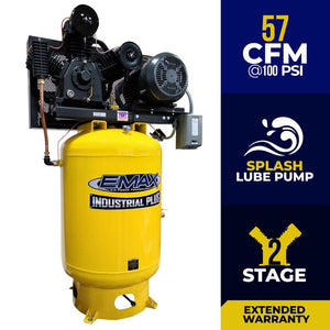 • EMAX Premium 7.5HP 208-230/460V 3-Phase 120 gal. Vertical Stationary Electric Air Compressor w/ Air Silencer & Pressure Lube Pump