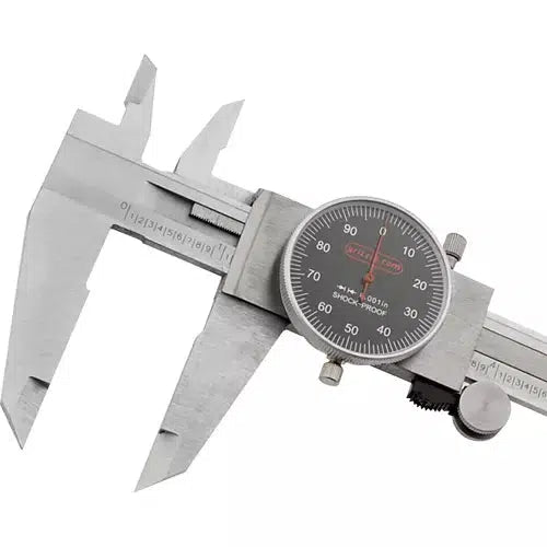 Easy to read black face dial caliper features .001" graduations, hardened and ground stainless steel main beam with hardened, ground and lapped measuring faces. Knurled thumb roll and 360 degree adjustable bezel make inside, outside and depth and step measurements quick and precise. Includes protective case.