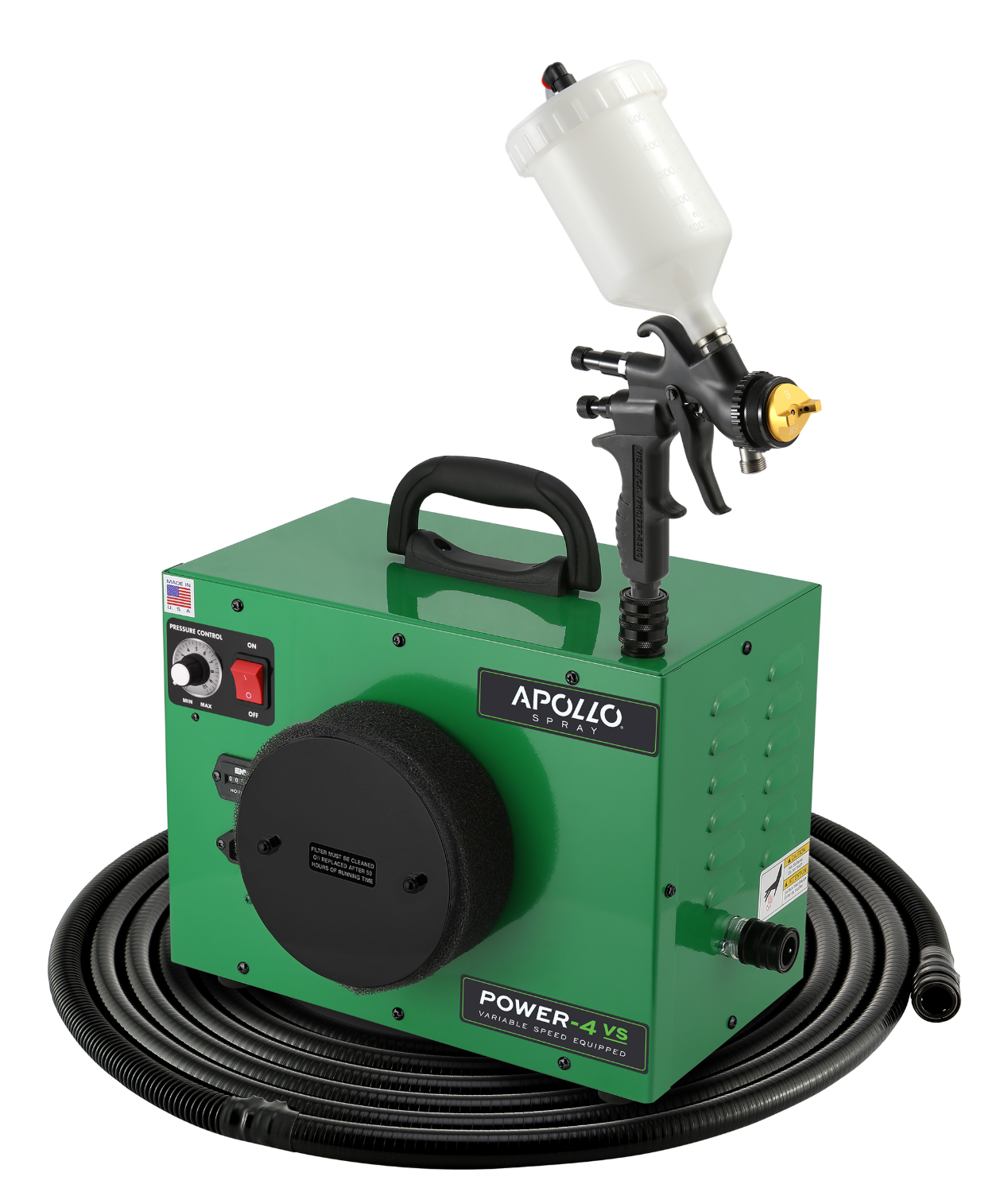 The POWER-4 VS TM includes enhanced 4-Stage Turbine power, Variable-Speed and exclusive features that put you in control of this advanced TrueHVLP ™ system for industries and applications demanding precision HVLP technology for the perfect finish. The POWER-4 VS TM can be used for the wide range of coatings, solvent or water base, clear or pigmented as well as specialized materials: faux paints, gelcoat, latex (emulsion) and multi-spec.