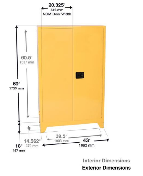45 Gallon, self-closing, Flammable Liquid Safety Cabinet is constructed of 18-gauge (1 mm) steel. The sides, top, bottom, and doors are double-walled with a 1-1/2 in (3.8 cm) air space between walls. Includes two vents, each have 2 in (5.1 cm) threaded fittings and a fire baffle and cap. Cabinets have a high gloss powder coat finish with red trilingual warning, plus grounding attachment, 3-point latch system, and 2-in (5.1 cm) raised, leakproof door sill. Each shelf is adjustable on 3 in (7.6 cm) centers, supported by 4 brackets, with a 350 lbs (159 kg) safe allowable load. Cabinets are FM-Approved and meet NFPA Code 30 and OSHA requirements.