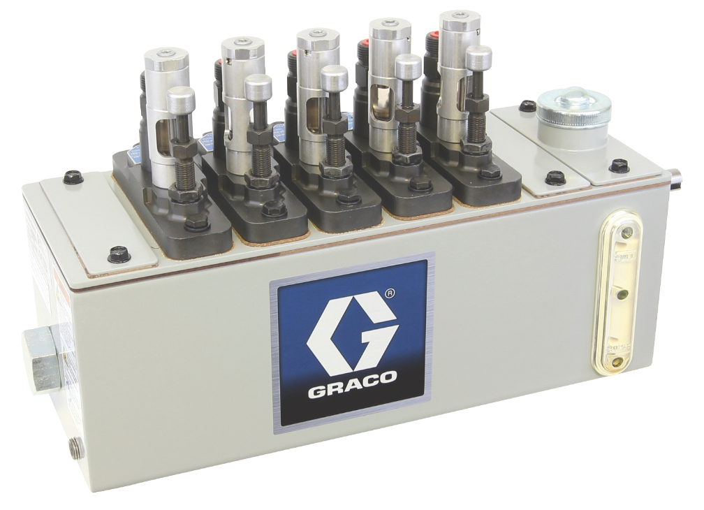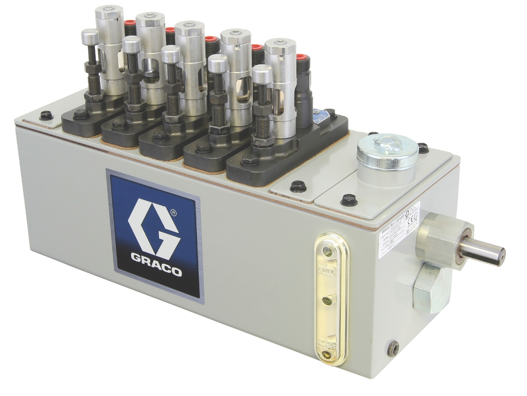 Graco 24W635 Manzel® MB118 Series Lubricator - 6 Pint (2.8 liter) Reservoir (6 Pump Stations Max), 1/4 in GBL 7500 Pump (qty 5), 118:1 drive on right hand end