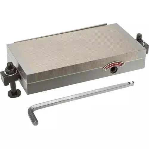 Nothing beats a Magnetic Chuck for surface grinding applications. This dense magnetic chuck features finely spaced brass and steel pole divisions for uniformly holding small parts. Includes toe clamps, removable handle, and adjustable side rail.