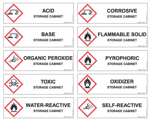Exclusive to Justrite, each cabinet comes with a "Hazardous - Keep Fire Away" label, as well as a pack of ten application-specific labels to choose from and apply to the cabinet in order to indicate its contents.