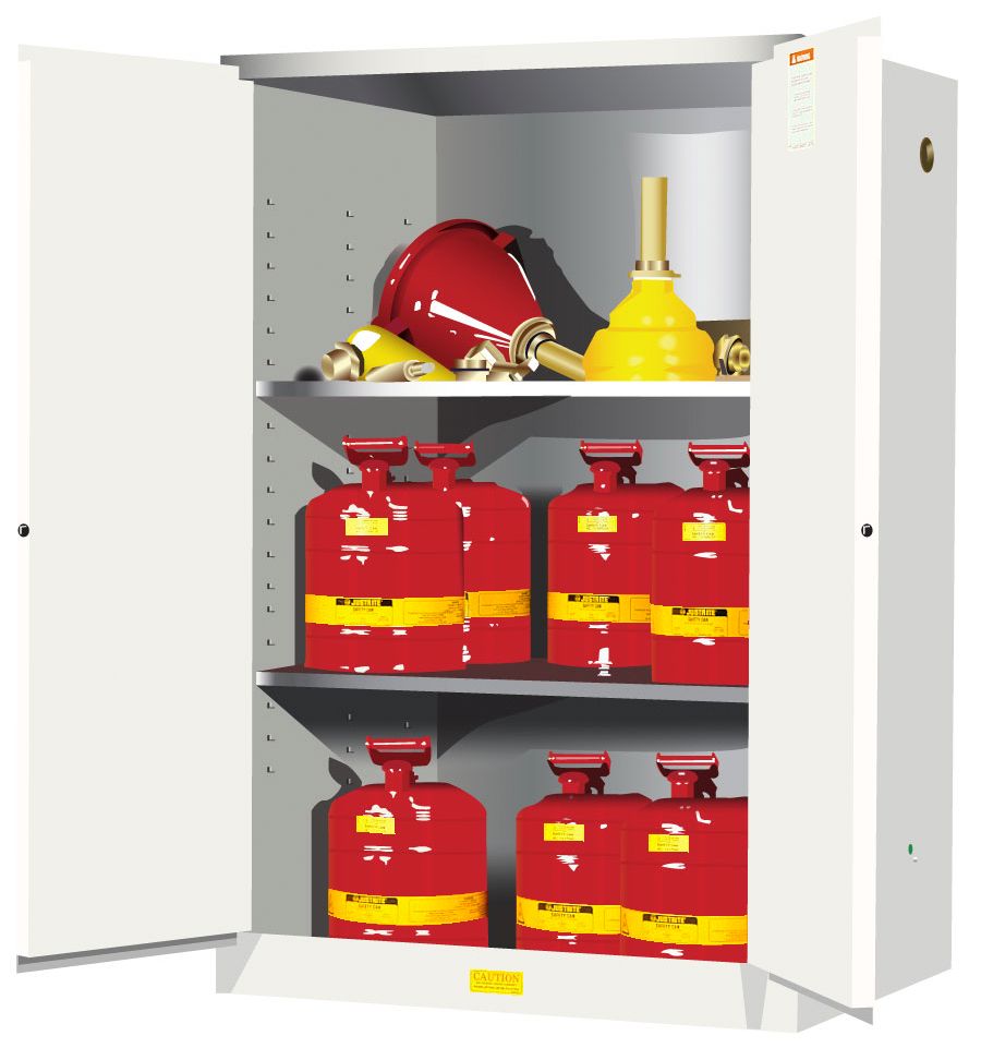 Protect workers, reduce fire risks, and improve productivity by storing flammable fuels and chemicals in code-compliant safety cabinets. Designed to meet OSHA and NFPA standards, Sure-Grip®EX cabinets are constructed of sturdy 18-gauge (1-mm) thick double-wall, welded steel with 1-1/2” (38-mm) of insulating air space for fire resistance. High-performance, self-latching doors close easily and securely for maximum protection under fire conditions. Fail-safe closing mechanism ensures three-point stainless steel bullet latching system works every time.