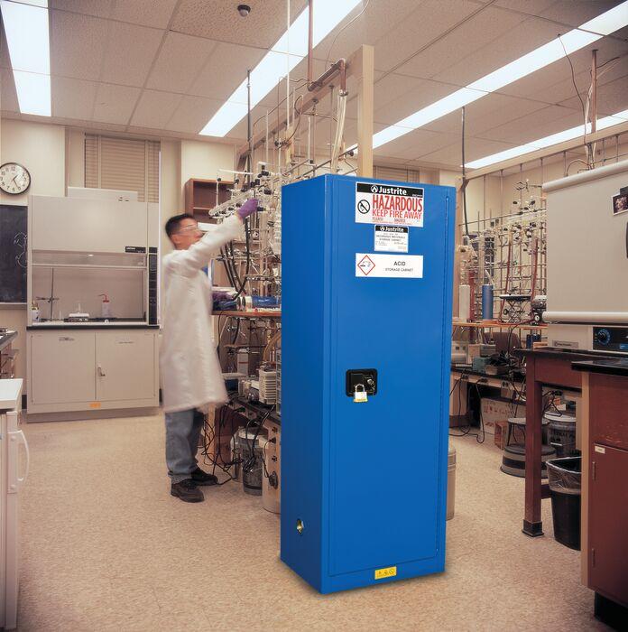 Justrite Slimline Hazardous Material Safety Cabinets have the same quality safety features as the cabinets for flammables. All models come with double-wall construction, dual vents, grounding wire connections, adjustable shelves, leakproof sills, three-point self-latching doors and leveling feet. Self-close door(s) shuts and latches automatically when a fusible link melts at 165°F (74ºC) under fire conditions. Unique, concealed self-closing mechanism offers obstruction-free access to contents.