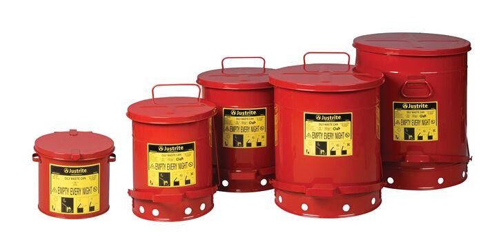 Dispose of oil-soaked rags and protect from fires that start due to spontaneous combustion, sparks or careless use of smoking material. Rags and cloths soaked with flammable liquids present a serious fire risk when improperly discarded. Specially designed lid opens no more than 60° and stays closed when not in use, isolating contents from fire sources and limiting oxygen, virtually eliminating risk of spontaneous combustion. Round construction and elevated bottom encourage circulation of air around can to disperse heat and reduce moisture buildup and rusting. Galvanized steel body with a durable powder-coat paint finish. Red. FM tested and approved, UL® listed, and TÜV certified.