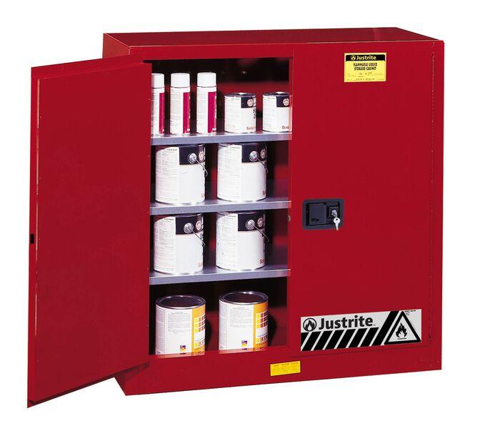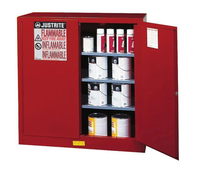 Easily separate and identify Class III combustibles using these red safety cabinets. Adjustable shelves accommodate many smaller paint tins, aerosols and inks found in printing, painting, furniture and motor vehicle operations. Sure-Grip® EX combustibles storage cabinets have all the same quality features as Justrite’s flammable cabinets as outlined below.