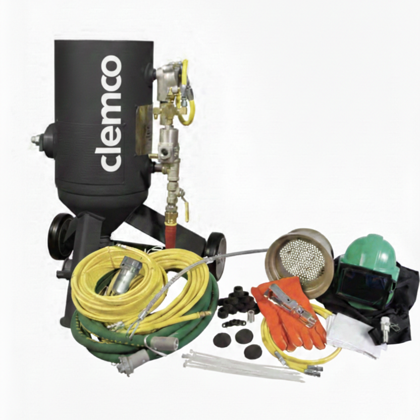 Clemco Classic Blast Machine Model 1028 LP Complete Package is a Low Pressure Breathing Air System*, Portable, 0.5 cuft - 50lbs. with 1/2 inch Piping. The 0.5 cu.ft classic blast machine holds ½ cubic foot (approximately 50 lbs.) of abrasive blast media. This small, one-man portable blast machine has ½” piping and comes with a Manual Sand Valve (MSV) and remote control system. This high-performance and versatile blast machine with complete low-pressure package is an economic way to remove contamination, corrosion, mill scale, and coatings from most surfaces. Using a No. 3 (3.16-inch) blast nozzle will provide approximately 15 minutes of productive blasting at 80 psi.