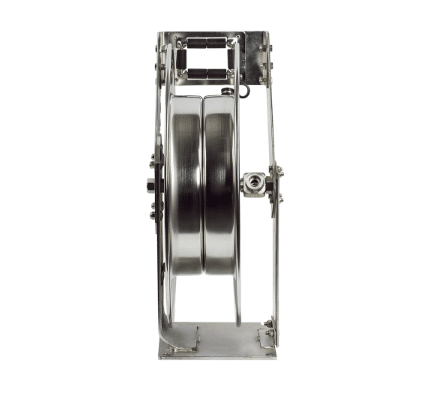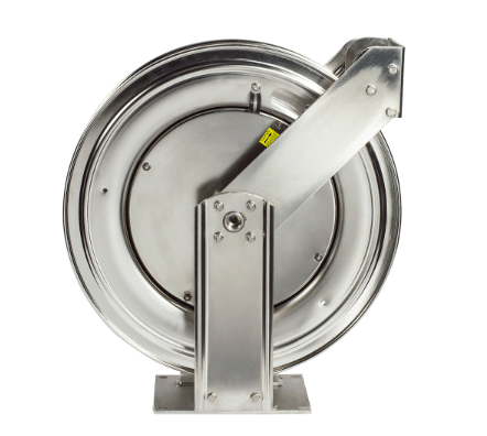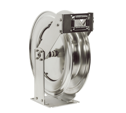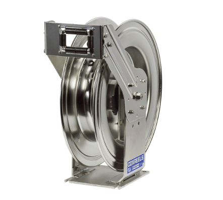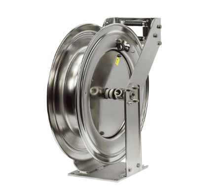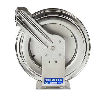 COXREELS® SS Series "Stainless Steel" spring driven hose reels have similar features to their related series, but are constructed of high quality electro-polished stainless steel with stainless steel fluid paths. They offer clean, non-corrosive performance in applications that require it, such as food and chemical processing, marinas, and anywhere that rust, corrosion and contamination thrive.