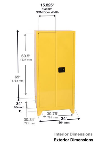 60 Gallon, self-closing, Tower™ Flammable Liquid Safety Cabinet is constructed of 18-gauge (1 mm) steel and has 4 in (10.2 cm) adjustable legs. The sides, top, bottom, and doors are double-walled with a 1-1/2 in (3.8 cm) air space between walls. Includes two vents, each have 2 in (5.1 cm) threaded fittings and a fire baffle and cap. Cabinets have a high gloss powder coat finish with red trilingual warning, plus grounding attachment, 3-point latch system, and 2-in (5.1 cm) raised, leakproof door sill. Each shelf is adjustable on 3 in (7.6 cm) centers, supported by 4 brackets, with a 350 lbs (159 kg) safe allowable load. Cabinets are FM-Approved and meet NFPA Code 30 and OSHA requirements.
