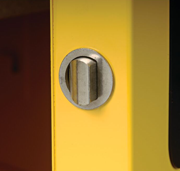 90 Gallon, self-closing, Tower™ Flammable Liquid Safety Cabinet is constructed of 18-gauge (1 mm) steel and has 4 in (10.2 cm) adjustable legs. The sides, top, bottom, and doors are double-walled with a 1-1/2 in (3.8 cm) air space between walls. Includes two vents, each have 2 in (5.1 cm) threaded fittings and a fire baffle and cap. Cabinets have a high gloss powder coat finish with red trilingual warning, plus grounding attachment, 3-point latch system, and 2-in (5.1 cm) raised, leakproof door sill. Each shelf is adjustable on 3 in (7.6 cm) centers, supported by 4 brackets, with a 350 lbs (159 kg) safe allowable load. Cabinets are FM-Approved and meet NFPA Code 30 and OSHA requirements.