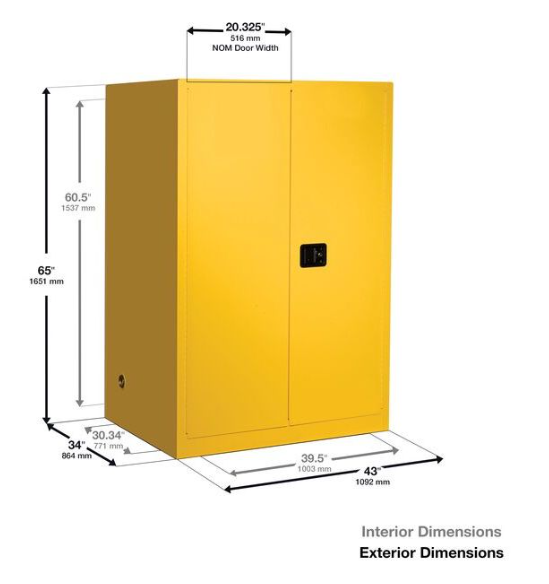 90 Gallon, manual close, Flammable Liquid Safety Cabinet is constructed of 18-gauge (1 mm) steel. The sides, top, bottom, and doors are double-walled with a 1-1/2 in (3.8 cm) air space between walls. Includes two vents, each have 2 in (5.1 cm) threaded fittings and a fire baffle and cap. Cabinets have a high gloss powder coat finish with red trilingual warning, plus grounding attachment, 3-point latch system, and 2-in (5.1 cm) raised, leakproof door sill. Each shelf is adjustable on 3 in (7.6 cm) centers, supported by 4 brackets, with a 350 lbs (159 kg) safe allowable load. Cabinets are FM-Approved and meet NFPA Code 30 and OSHA requirements.