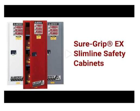 Protect workers, reduce fire risks, and improve productivity by storing flammable fuels and chemicals in code-compliant safety cabinets. Designed to meet OSHA and NFPA standards, Sure-Grip®EX cabinets are constructed of sturdy 18-gauge (1-mm) thick double-wall, welded steel with 1-1/2” (38-mm) of insulating air space for fire resistance. High-performance, self-latching doors close easily and securely for maximum protection under fire conditions. Fail-safe closing mechanism ensures three-point stainless steel bullet latching system works every time.