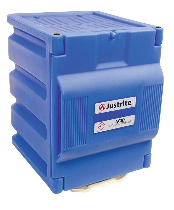 Hollow-bodied, polyethylene cabinet withstands highly corrosive acids and offers maximum protection against chemical corrosion and leaks. Clearly labeled for ACID contents and accepts a padlock (not included) for added security. Stores up to (2) 1-qt. bottles. Door can be hinged from either side for best worktop space utilization. Polyethylene spill tray inside contains leaks and can be removed for easy cleaning. Separate polyethylene tray stores under the cabinet and can be used as a handy work tray.Measures: 19 1/2" H x 14 1/4" W x 16 1/4" D. Blue.