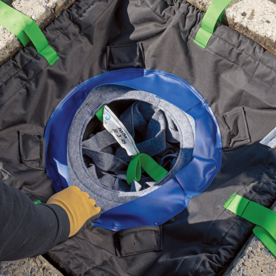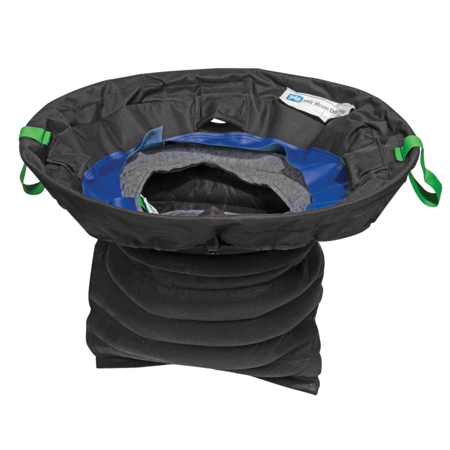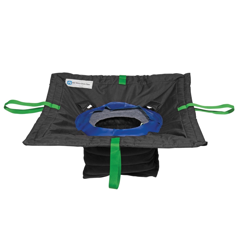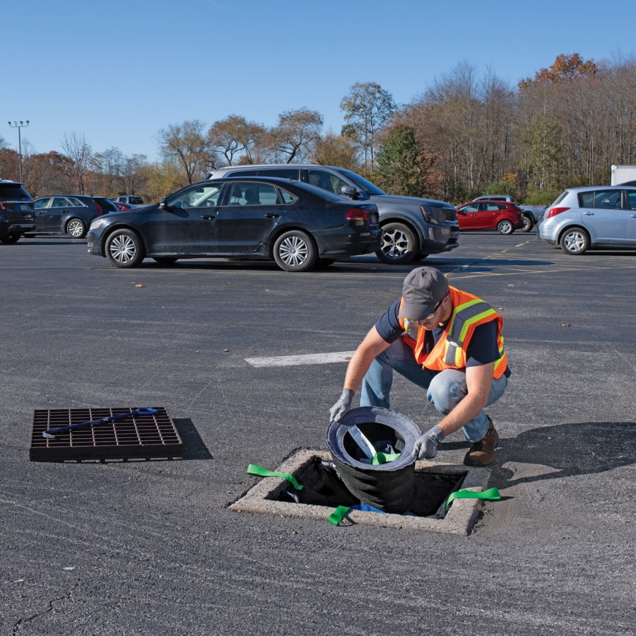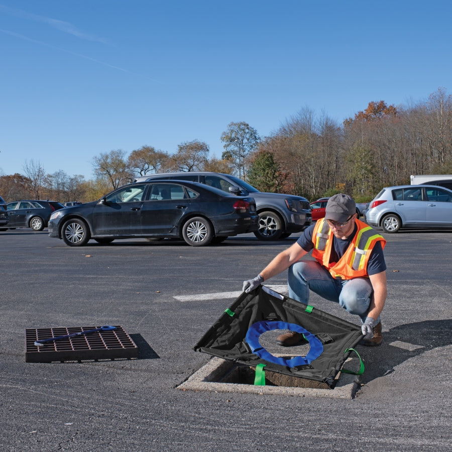 High-visibility color of straps helps inspectors see from a distance, even with grate in place, that you're proactively managing your stormwater; also serves as a visual reminder for on-site maintenance