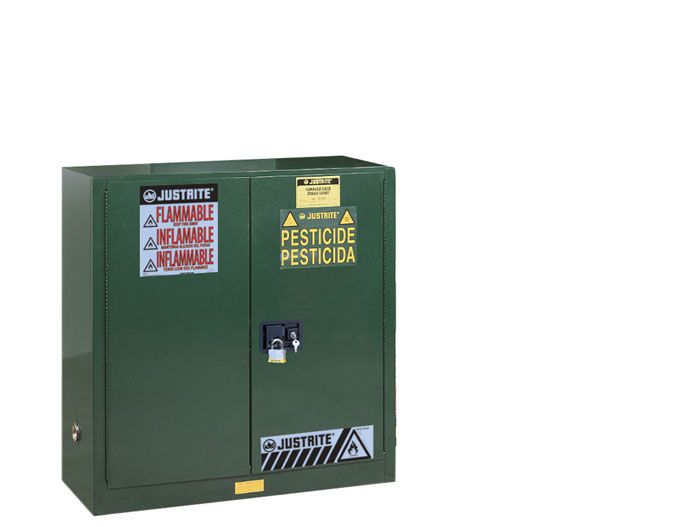 Pesticides present a substantial danger to people and the environment when improperly stored. Pesticide safety cabinets allow segregation of liquids stored at the worksite, eliminating the potential for drips and spills during the transfer of pesticides. Dissimilar pesticides stored separately prevent one from contaminating another or the accidental use of the wrong chemical.